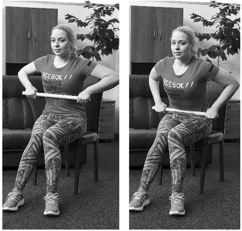 И.П. сидя на краю стула или даже стоя, наклонив тело вперед, желательно после душа (мокрое тело), массируйте живот палкой, взяв ее за концы, снизу вверх. Заодно можно промассировать ягодицы и поясницу. От одной до пяти минут.