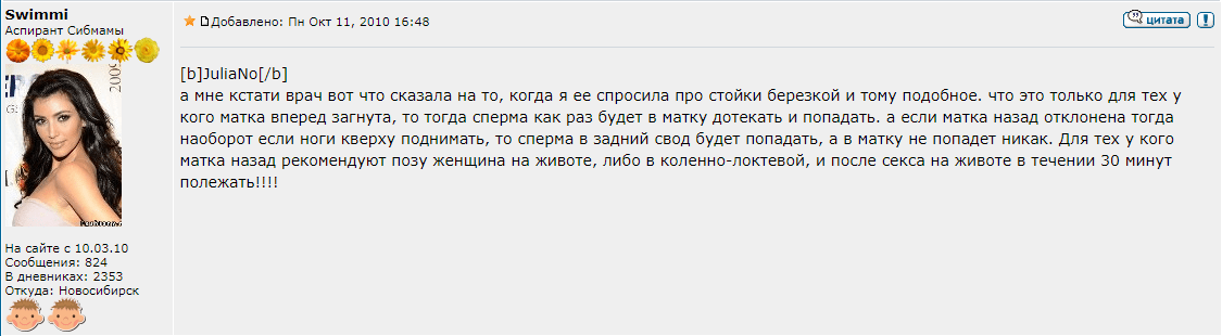 А вот сексолог-психотерапевт Кульгавчук Е. А. вполне допускает, что правильные позы и удержание спермы после секса могут поспособствовать зачатию. В своей статье он рекомендует догги-стайл и офицерскую, но с поправкой на расположение влагалища. Если оно ближе к брюшной полости (королек), то вероятность зачатия повышается в различных вариациях миссионерской позы. Если влагалище сдвинуто к спине (сиповка), то лучше использовать догги-стайл. После эякуляции врач рекомендует женщине полежать с приподнятым тазом от 10 до 30 минут.