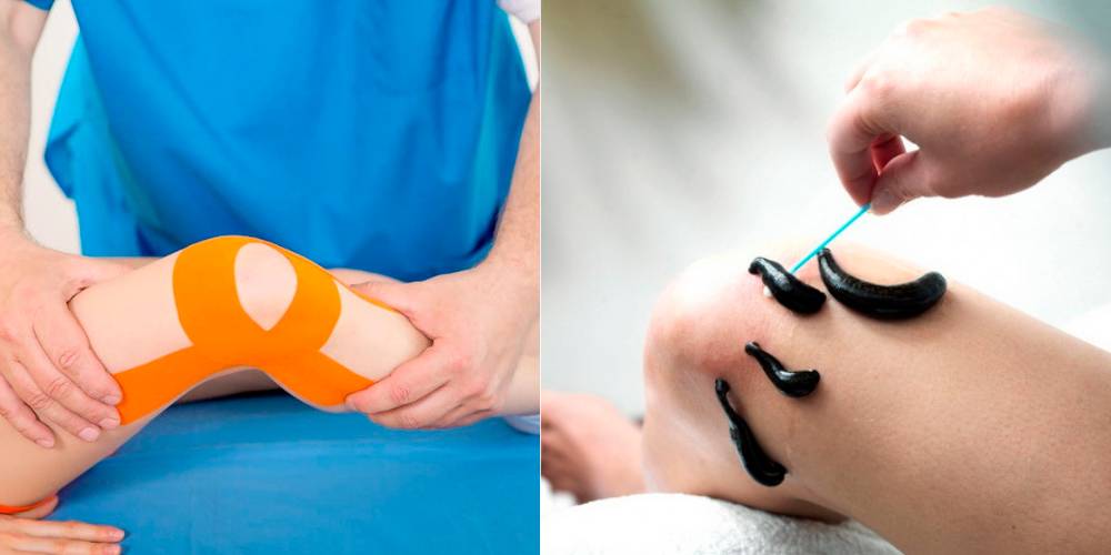 - Тейпирование. Больному фиксируют колено в нужном положении при помощи клейкой ленты. Подробнее об этом в данной статье.