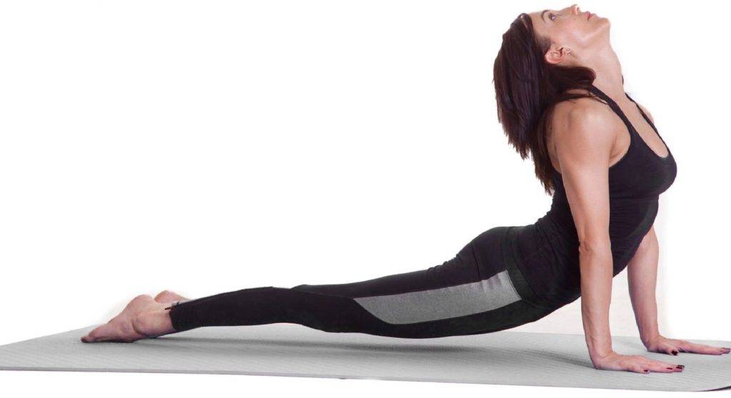 Необходимо вдохнуть и выпрямить ноги, ладони держать неподвижно. Грудную клетку и подбородок поднять вверх, прогнуться и направить взор вверх. Положить ноги и бедра на пол, лобком прижаться к поверхности пола. При возникновении неприятных ощущений в области поясницы выпрямлять руки в локтях не полностью, сжать бедра и ягодицы.