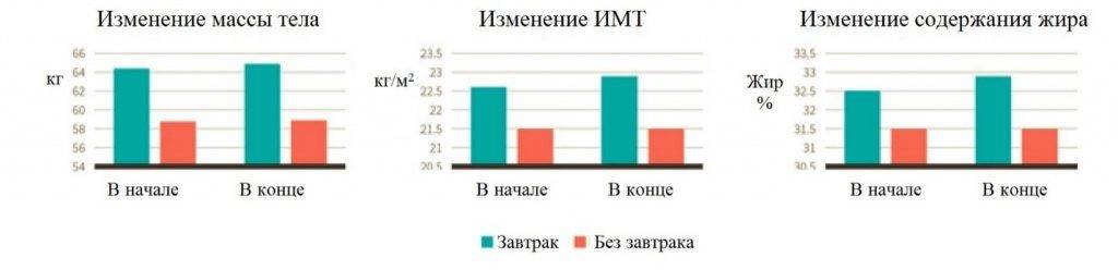 При этом женщины, которые регулярно завтракали, прибавили в среднем по 0.7 кг, а ИМТ увеличился с 22.6 до 22.9 (разница небольшая, но достоверная). Незначительно возросло содержание жира – с 32.5 до 32.9%. В контрольной группе (те, кто не завтракал) вес и ИМТ оставались стабильными и к концу эксперимента были значительно ниже, чем в группе «завтрак». Мышечная масса у всех женщин осталась без изменений.