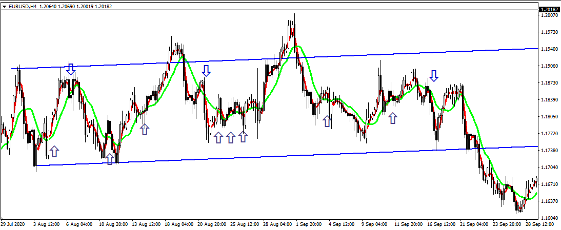 Например, вот я обозначил уровни поддержки и сопротивления. Поддержка внизу, сопротивление сверху. Торговать по импульсным волнам – значит открываться, когда цена касается поддержки (зеленые стрелочки). Торговать по коррекциям – открываться на понижение от сопротивления (красные стрелочки).