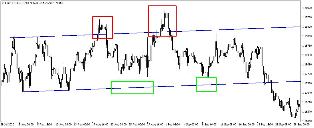 Вот я отложил поддержку и сопротивление – и что? Когда можно было открываться на понижение, рынок сильно пробивал сопротивление и уходил наверх (красные квадраты) – скорее всего, я потерял бы на таких движениях деньги. До поддержки цена тоже не доходила (зеленые квадраты) и если бы я все-таки открылся и удержал позицию, я не знал бы, где ее закрывать.