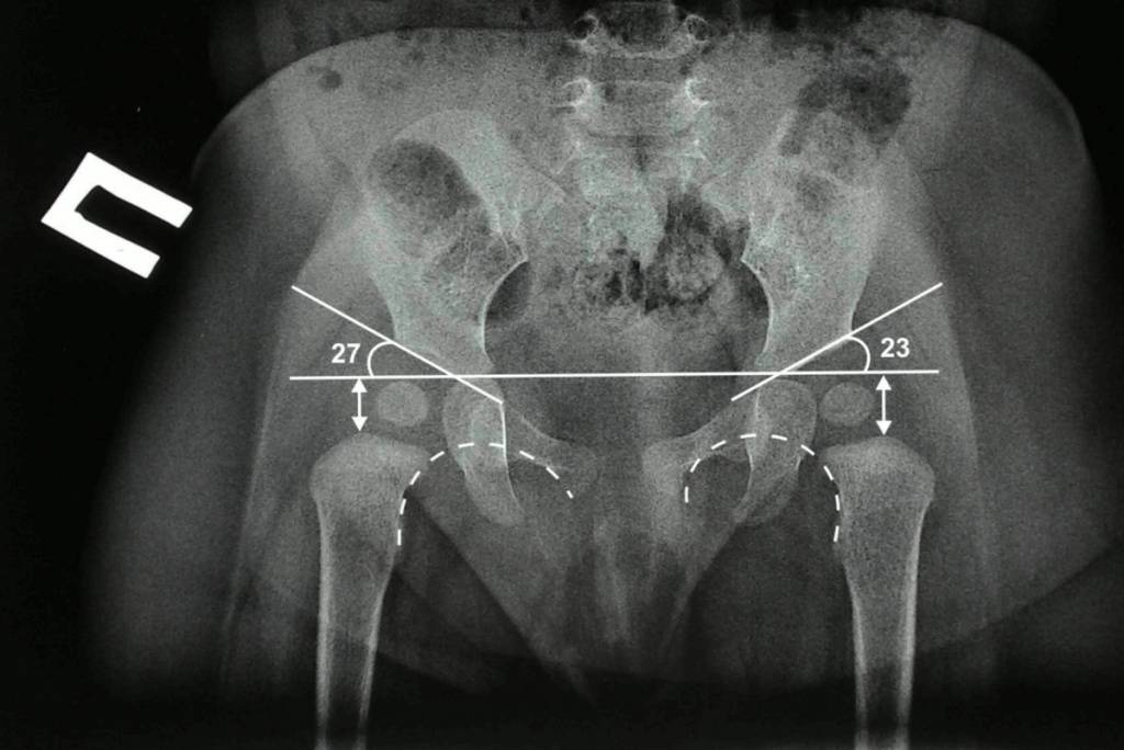 У новорожденных вертлужная впадина и большая часть бедренной головки представлены хрящевой тканью, поэтому на рентгенологических снимках не видны. Для трактовки результатов используют различные схемы с проведением специальных линий, чтобы рассчитать угол наклона крыши вертлужной впадины. В норме он должен быть не меньше 30° у новорожденных и примерно 20° – у малышей от трех месяцев и старше.