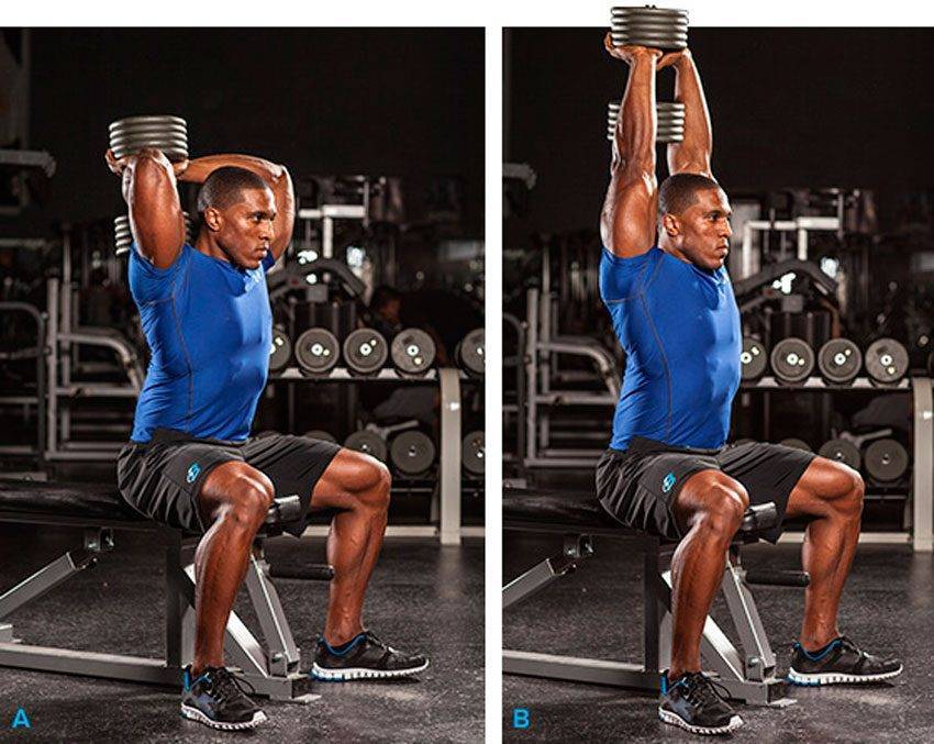 Если гантель всего одна, французский жим лучше выполнять на ногах или присев на спортивную скамью.