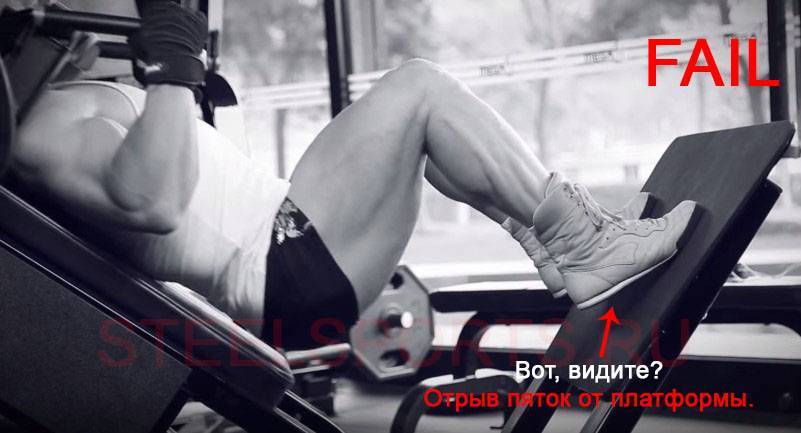 - Не разминаться перед выполнением упражнения и брать с самого начала свой рабочий вес. Лучше всего потратить минимум 15 минут на разминку нижней части туловища, а вес отягощения наращивать постепенно. Например, если ваш рабочий вес 100 кг, то для начала сделайте разминочный подход на 40кг., потом 60кг, 80 и только потом 100 килограмм.