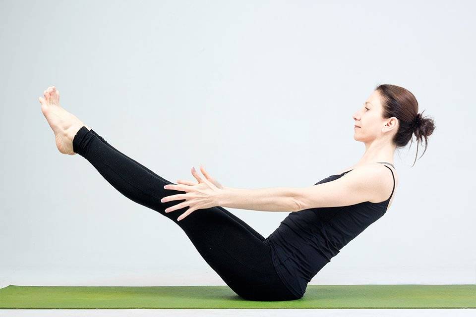 1. Парипурна навасана. Сядьте на пол и вытяните ноги. Отклоните туловище самую малость назад, при этом приподняв ноги, а руки протяните вперед. Балансируйте секунд десять, после вернитесь к исходному положению. Сделайте несколько подходов.