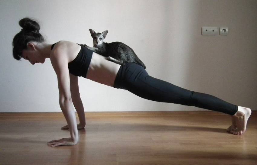 - «Кошечка». Встать на четвереньки. На выдохе округлить спину, на вдохе — прогнуться. При выполнении необходимо настроиться на позитивную волну: на выдохе из души выйдет весь негатив, на вдохе — произойдет накопление полезной энергии.