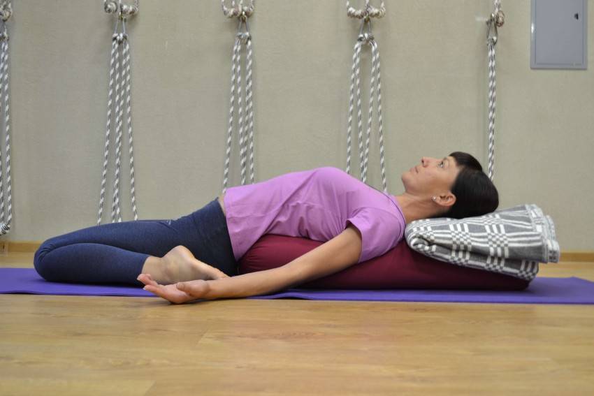 Для упрощения позы нужно приподнять таз чуть выше, подложив под него одеяло или блок