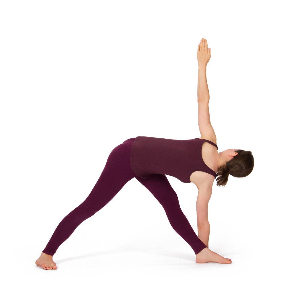 Поза треугольника (УТТХИТА ТРИКОНАСАНА). Расставьте ноги приблизительно на метр. Правую стопу поверните полностью вправо, а левую — лишь на 45 градусов. Постарайтесь подтянуть бока вверх, затем нагнитесь вправо, при этом правую руку опустите до пола, либо поставьте её на подъём стопы. Левой рукой как можно сильнее тянитесь вверх. Оставайтесь в таком состоянии полминуты. Затем повторите упражнение в противоположную сторону.