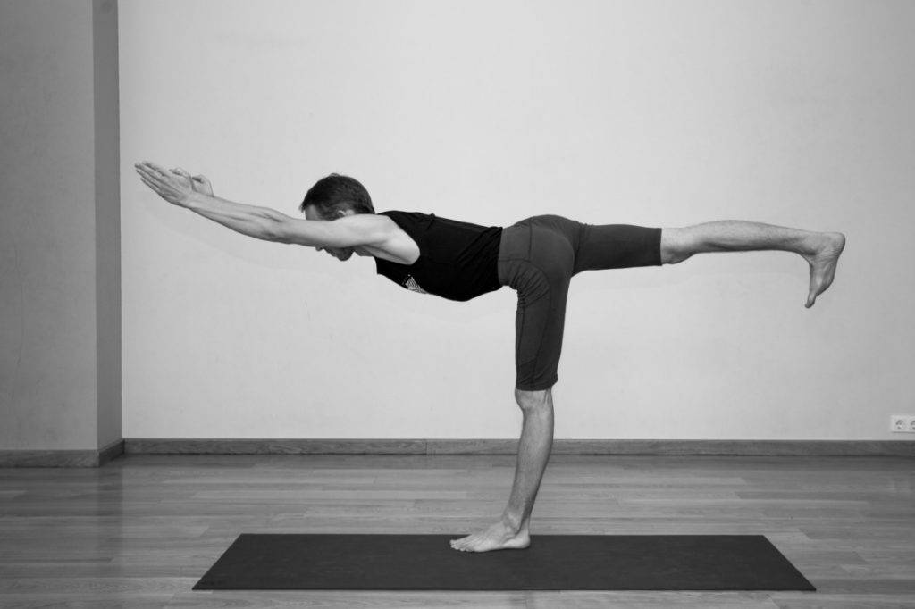 Если вам сложно удерживать баланс на одной ноге, то допускается согнуть опорную ногу.