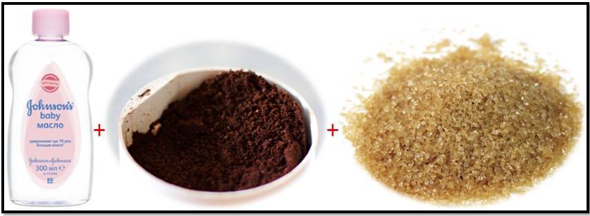 Скраб «секрет из Голливуда» – для приготовления необходимо смешать половину чашек измельченных зерен кофе с коричневым сахаром и залить их маслом Johnson’s Baby. Полученной маской натирают проблемные участки в течение 10 минут, после смывают теплой водой. Разрешена процедура трижды в неделю.