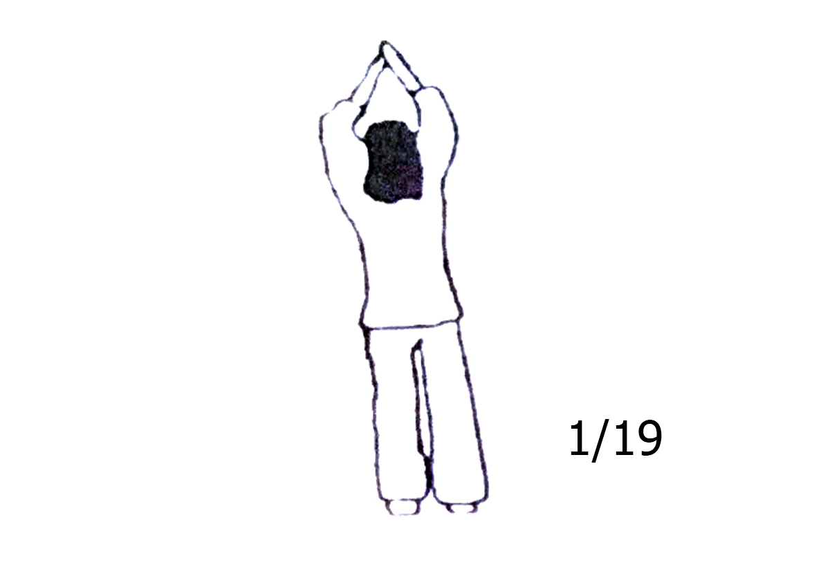 Вытянутые, соединенные над головой руки символизируют связь с Космосом, бескрайней Вселенной. Данный жест приводит в баланс внешний и внутренний миры. Постукивания ногами можно интерпретировать как “Я живу в ритме с Тобой”.