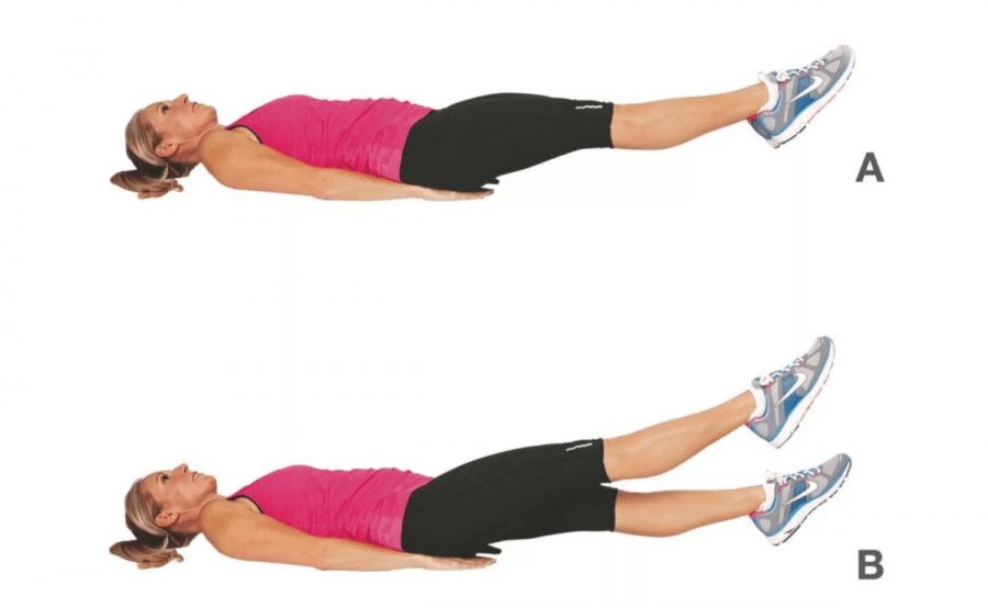 - Поднятие ног вверх из лежачего положения. Ноги медленно отрываются от пола, перпендикулярно поверхности, затем опускаются. Повторять 12 раз.