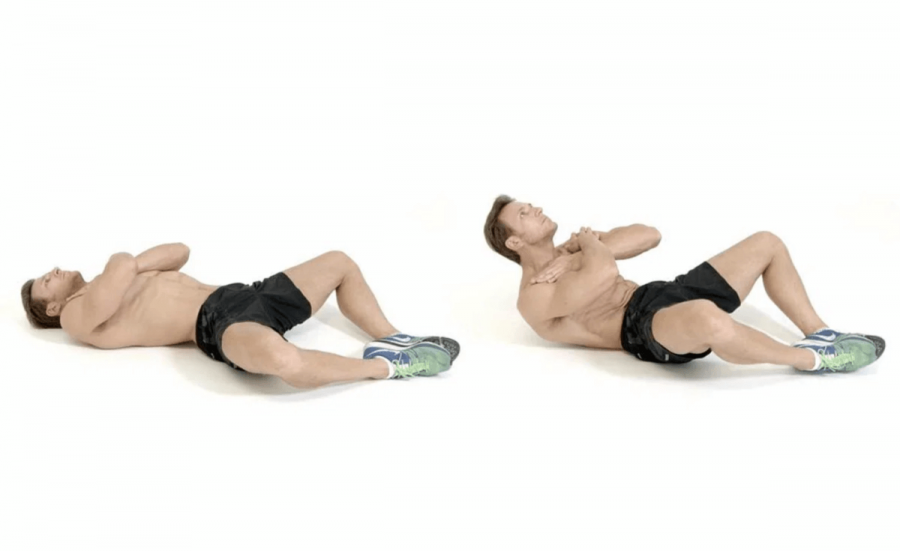Лечь на спину, соединив ступни и перекрестив руки на груди. Выполнить подъем плече-лопаточной части тела до максимума, опустить корпус вниз.