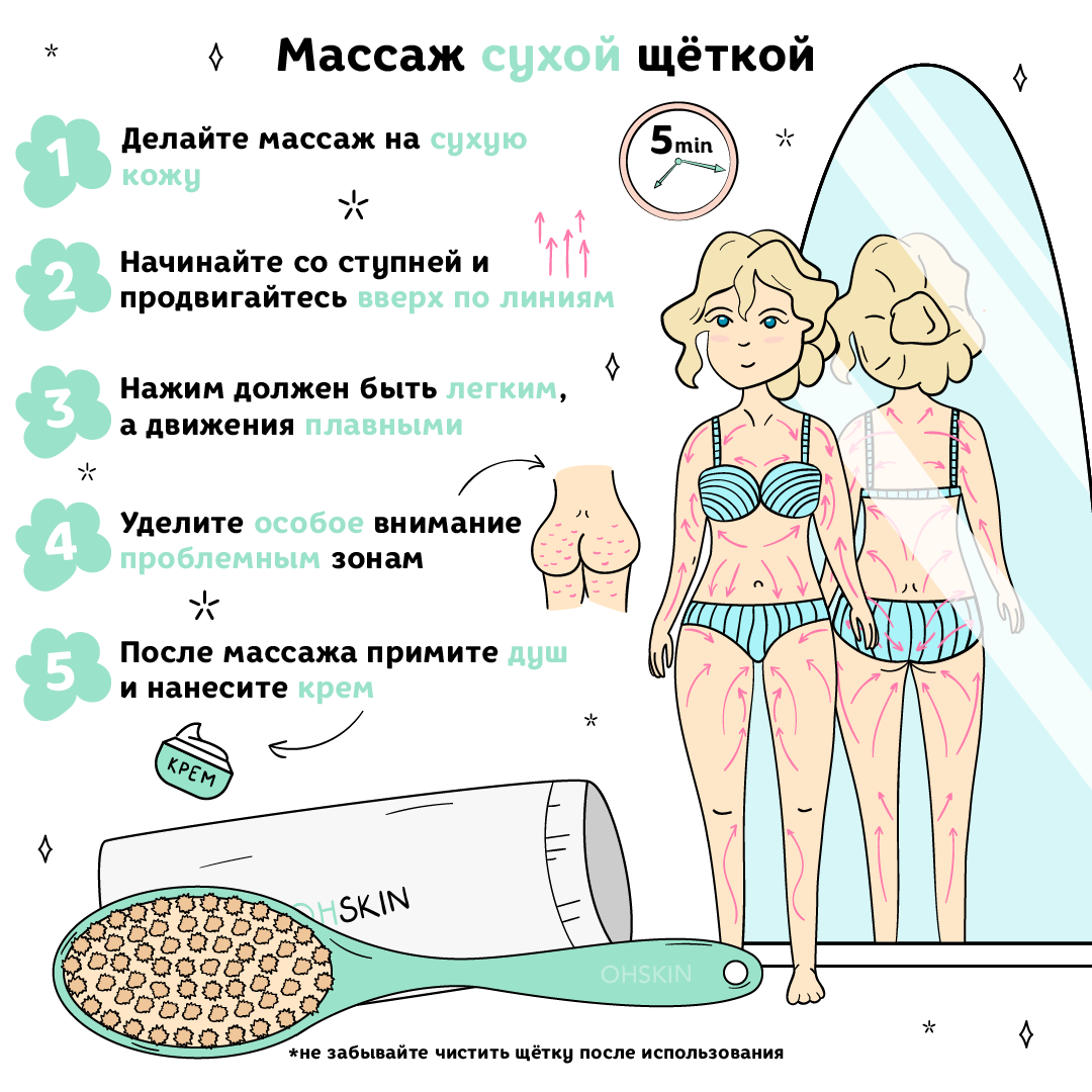 Массаж выполняют сухой щеткой. На кожу не следует наносить косметические средства