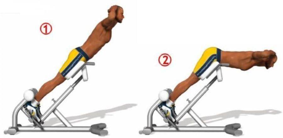 Гиперэкстензия. Для выполнения вам нужен тренажер, который можно найти в любом спортзале. Ложимся на него так, чтобы бедренные кости были навесу. Ногами упираемся в подставку, руки фиксируем за головой. Необходимо сгибаться так, чтобы в области таза создавался угол 90 градусов, затем разгибаться до положения, пока все тело не станет вытянуто в одну линию. Дома можно тренироваться на фитболе.