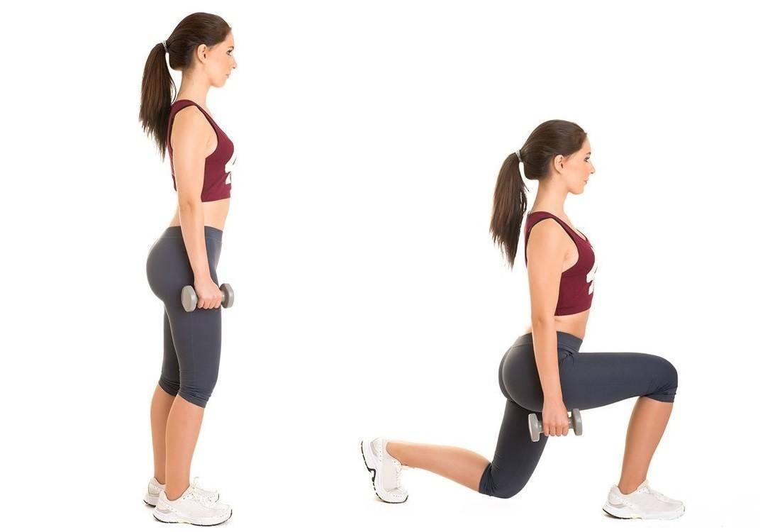 Выпады. Упражнение помогает сжечь жировые отложения и округлить попу. Для выполнения надо ровно стать, затем сделать шаг вперед, перенести на нее всю массу тела и присесть. В колене должен быть прямой угол, колено ноги, отведенной назад, смотрит в пол, спина прямая, пресс в напряжении, взгляд направлен вперед.
