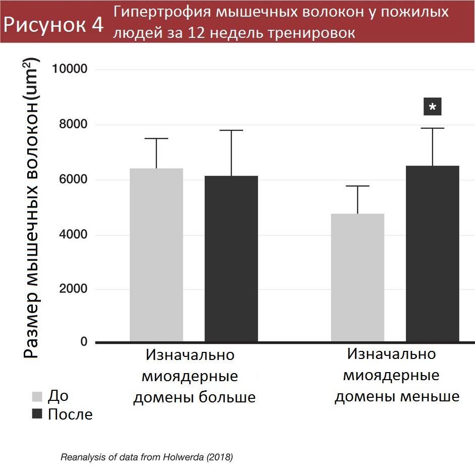 Результаты другого эксперимента с участием пожилых людей , правда, были противоположными: участники с меньшими миоядерными доменами смогли добиться значительной гипертрофии при тренировках, а участники с большими миоядерными доменами – нет.