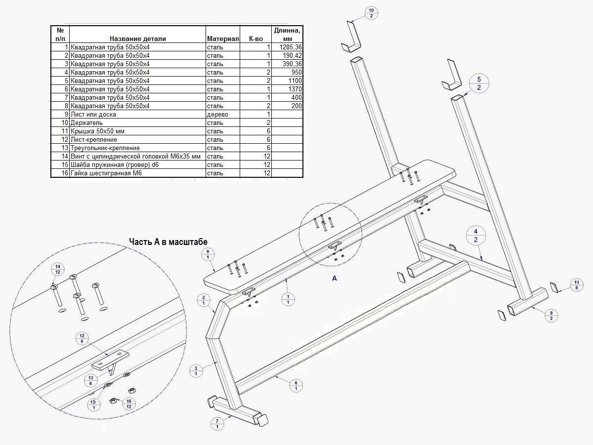 (пружинные шайбы), гайки, винты – по 12 штук. Они нужны, чтобы скрепить скамью.