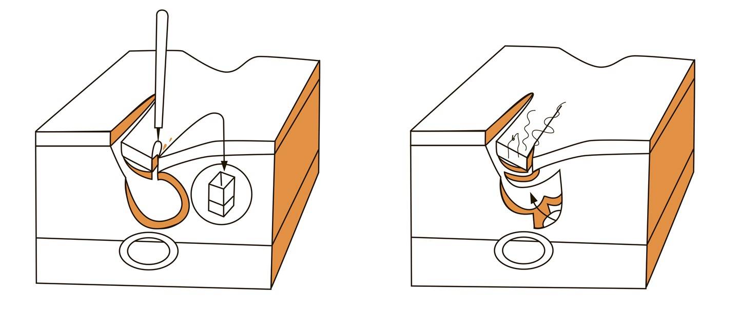 Еще одной, ранее популярной, методикой хирургического лечения ЭКХ является метод марсупилизации, который предполагает иссечение свищевого хода единым блоком с кожей и подкожно-жировой клетчаткой с последующим подшиванием кожных краев ко дну раны. Однако, в настоящее время данная методика практически не используется в связи с длительным реабилитационным периодом и неудовлетворительными косметическими результатами (рис 14).