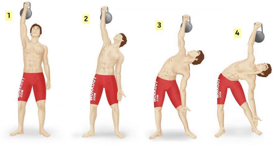 Поставьте ноги на ширину плеч и поднимите гирю над головой. Ваш вес должен быть немного смещен в сторону, когда вы держите гирю. Глядя на нее опустите торс, пока ваша рука не коснется пола.