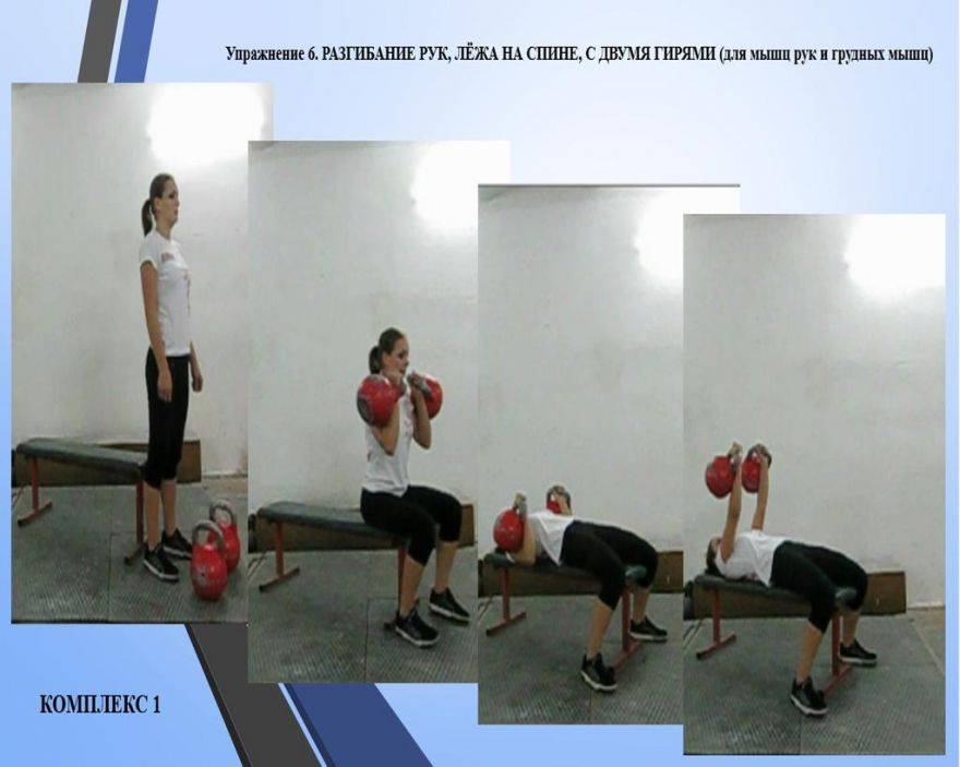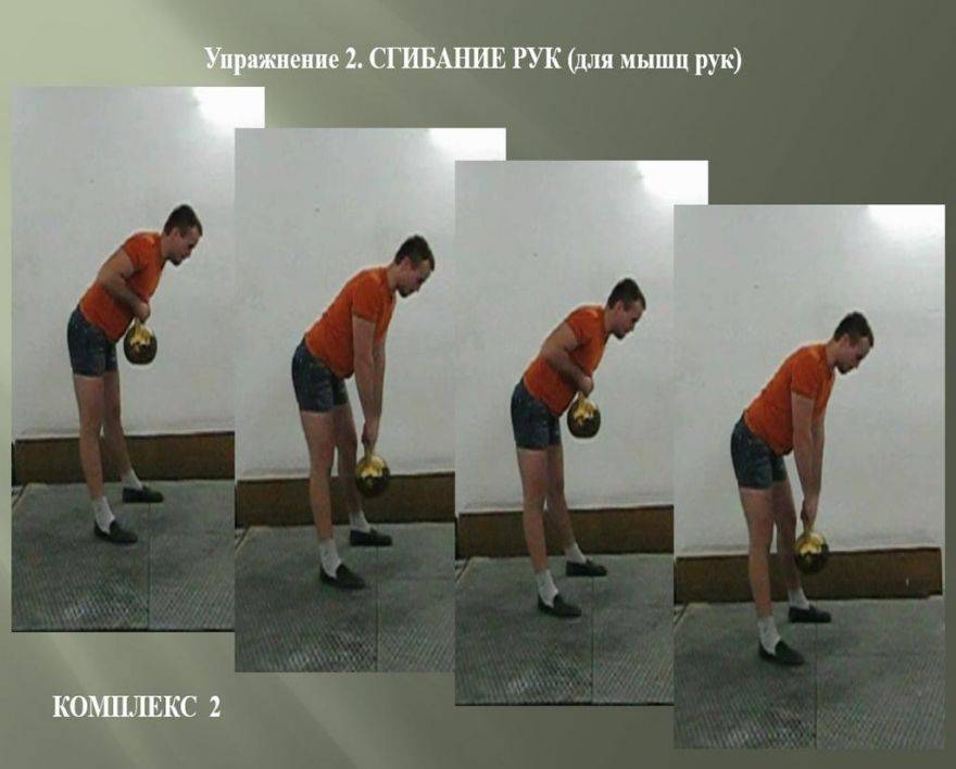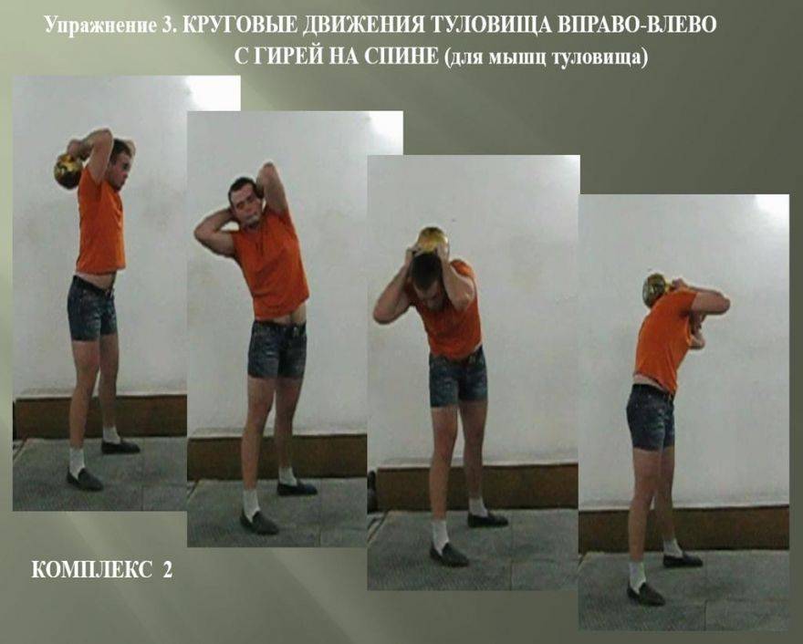 Итак, сначала комплекс упражнений в картинках с одной гирей.