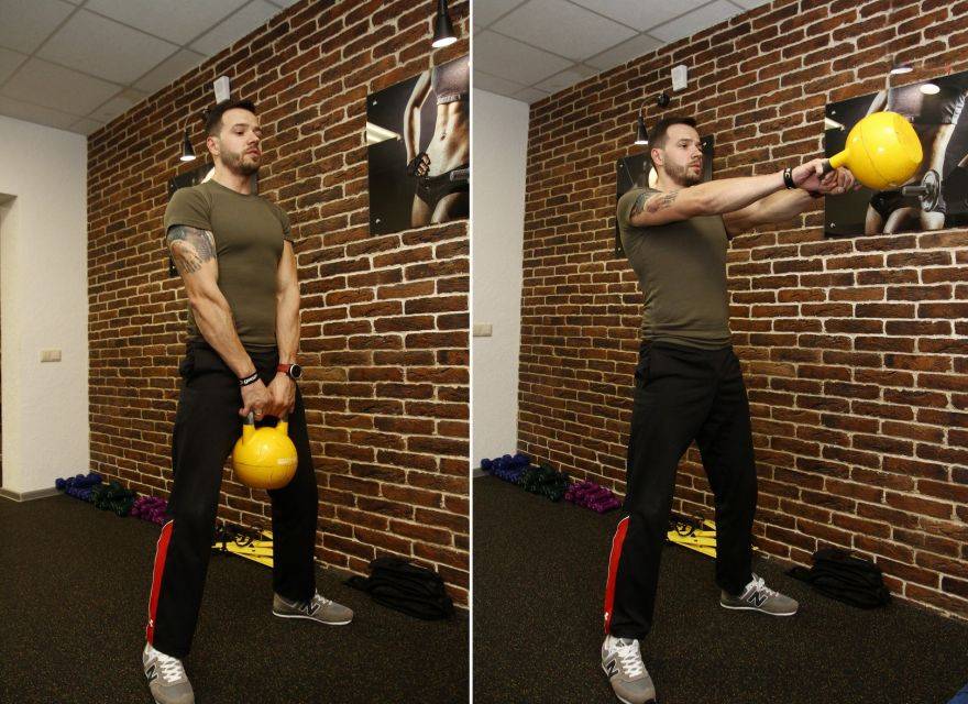 Поместите одну гирю между ног как показано на фото. Ноги слегка согните в коленях. Затем с силой рваните гирю вперед, подняв ее до уровня 90 градусов с корпусом.