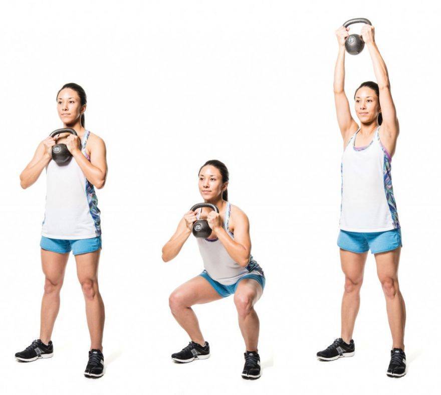Присядьте на корточки и закиньте гирю на плечо. Одну руку выставьте вперед для равновесия. Затем поднимите гирю вверх. Сделайте секундную паузу и вернитесь обратно. Повторите с другой рукой. Во время выполнения упражнения убедитесь, что вы хорошо сидите и ваши ягодицы с икрами напряжены.