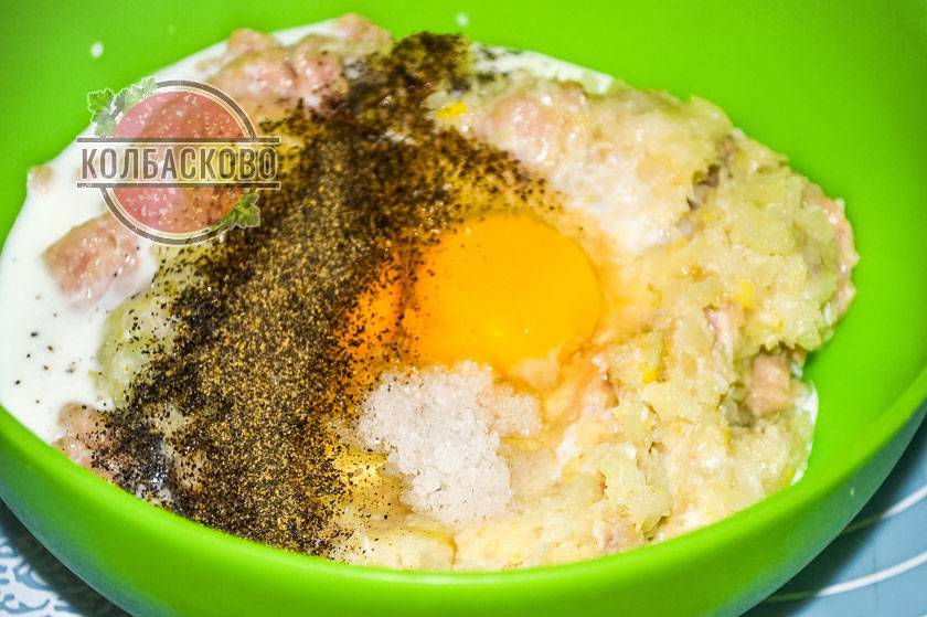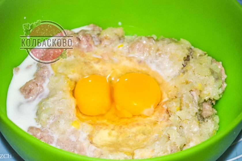 6. Вбиваем яйца. Они скрепят мясной фарш. Благодаря этому колбаса получится ровной и не будет распадаться.