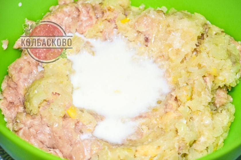 5. Наливаем в фарш с луком холодное молоко.