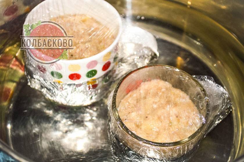 13. Отправляем кружки в кастрюлю с водой, чтобы воды было больше половины. Ставим на средний огонь и доводим до кипения. Готовим колбасу после закипания 40 минут. Кастрюлю желательно прикрыть крышкой, чтобы колбаса в кружках проварилась равномерно.