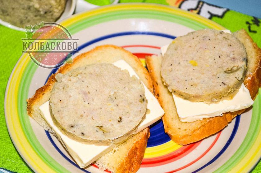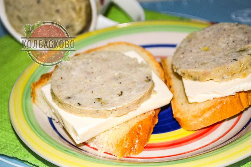 15. Остывшую колбасу вынимаем, нарезаем и подаем к столу. Вкуснейшая домашняя колбаса в кружке готова и бутерброды с ней просто отменные! Еще можно подать колбасу на второе с гарниром из гречки и любимым соусом.
