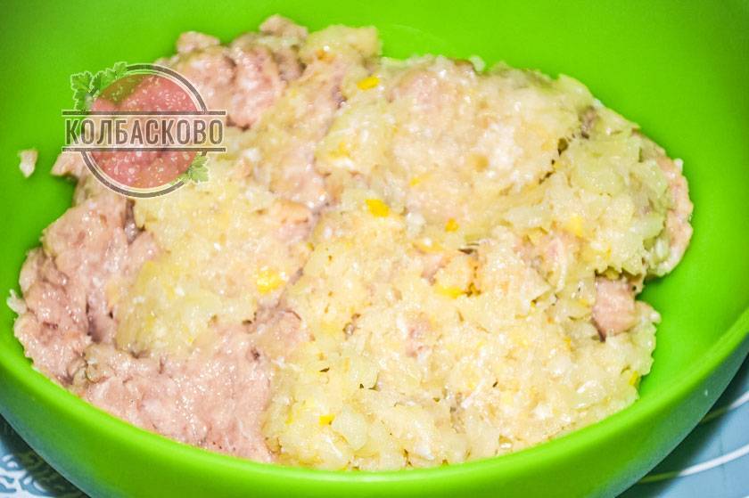 9. Перемешиваем все. Если фарш получается жидковатым, то добавляем манную крупу. Обычно она нужна. Манка вберет в себя лишнюю жидкость, загустеет, но совсем не будет чувствоваться в готовой колбасе.