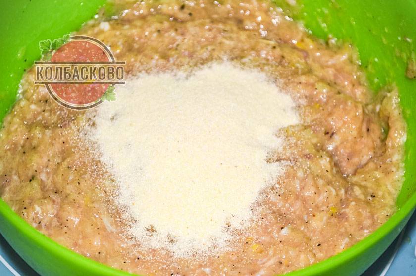 Сильно много манки не нужно добавлять, иначе колбаса получится сухой. Смотрим по консистенции фарша. Он не должен быть жидким, но и сильно густым не должен получиться. Перемешиваем фарш и оставляем на 10-15 минут, чтобы манка разбухла.
