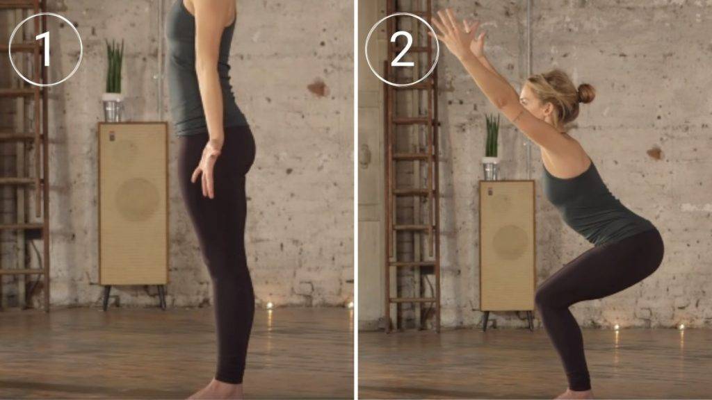 Уткатасана («Поза стула»). Встаньте прямо, ноги вместе, пятки прижаты друг к другу. Колени чуть согнуты. На выдохе опустите бёдра так, будто собираетесь сесть на стул и поднимите руки вверх. Не прогибайтесь в пояснице, спину держите ровной