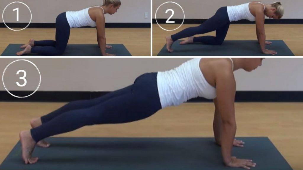 Кумбхакасана («Поза планки»). Встаньте на четвереньки, ладони находятся под плечами, колени под бёдрами. Поочередно выпрямите ноги, расставив стопы на ширину таза. Упор на пальцы ног. Следите, чтобы спина и ноги образовали прямую линию. Равномерно распределите вес тела, стараясь удерживать его мышцами живота. Дышите ровно и спокойно. Оставайтесь в таком положении 15–30 секунд.