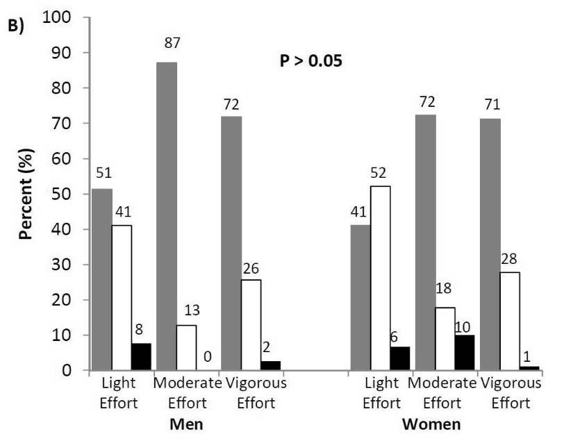 На этом графике результаты исследования – насколько мужчины (слева) и женщины (справа) переоценивали собственные физические усилия при слабой (light effort), средней (moderate effort) и высокой интенсивности (vigorous effort). Серые столбцы – участники напрягались ниже необходимого уровня, белые – в пределах нужного уровня интенсивности, черные – превышали заданную интенсивность.