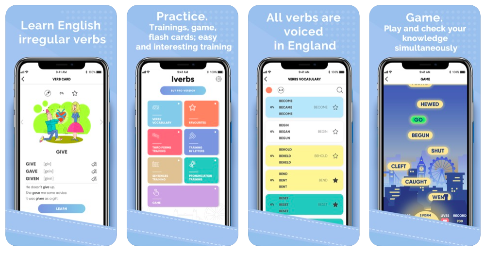 Эффективное приложение для изучения неправильных глаголов на английском языке. 187 неправильных глаголов озвучены носителями языка, что поможет улучшить произношение. Также есть красочные иллюстрации, с которыми проще и быстрее запоминать глаголы. Есть возможность составлять свои списки, выделяя слова разными цветами. Плюс приложения — есть флеш-карты, которые помогут с повторение уже выученных глаголов.