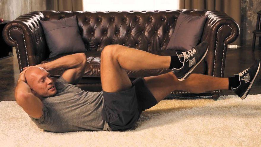 - Скручивания прямые. Упражнение выполняют лежа. Нужно согнуть колени на весу и двигаться локтями в их сторону.