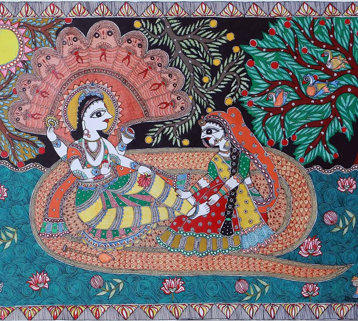 Старинная индийская картина “Вишну и Лакшми”