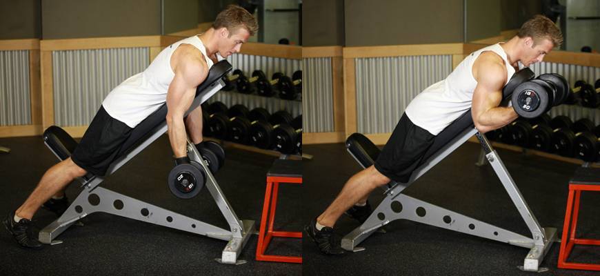 Еще немного усилий. Сядьте на наклонную скамью (угол 45 градусов), в каждую руку возьмите по гантели (ладони обращены к бедрам). Одновременно согните в локтях обе руки и подтяните вес к груди. Старайтесь двигать только руками, не помогайте себе корпусом (звучит намного проще, чем есть на самом деле!)