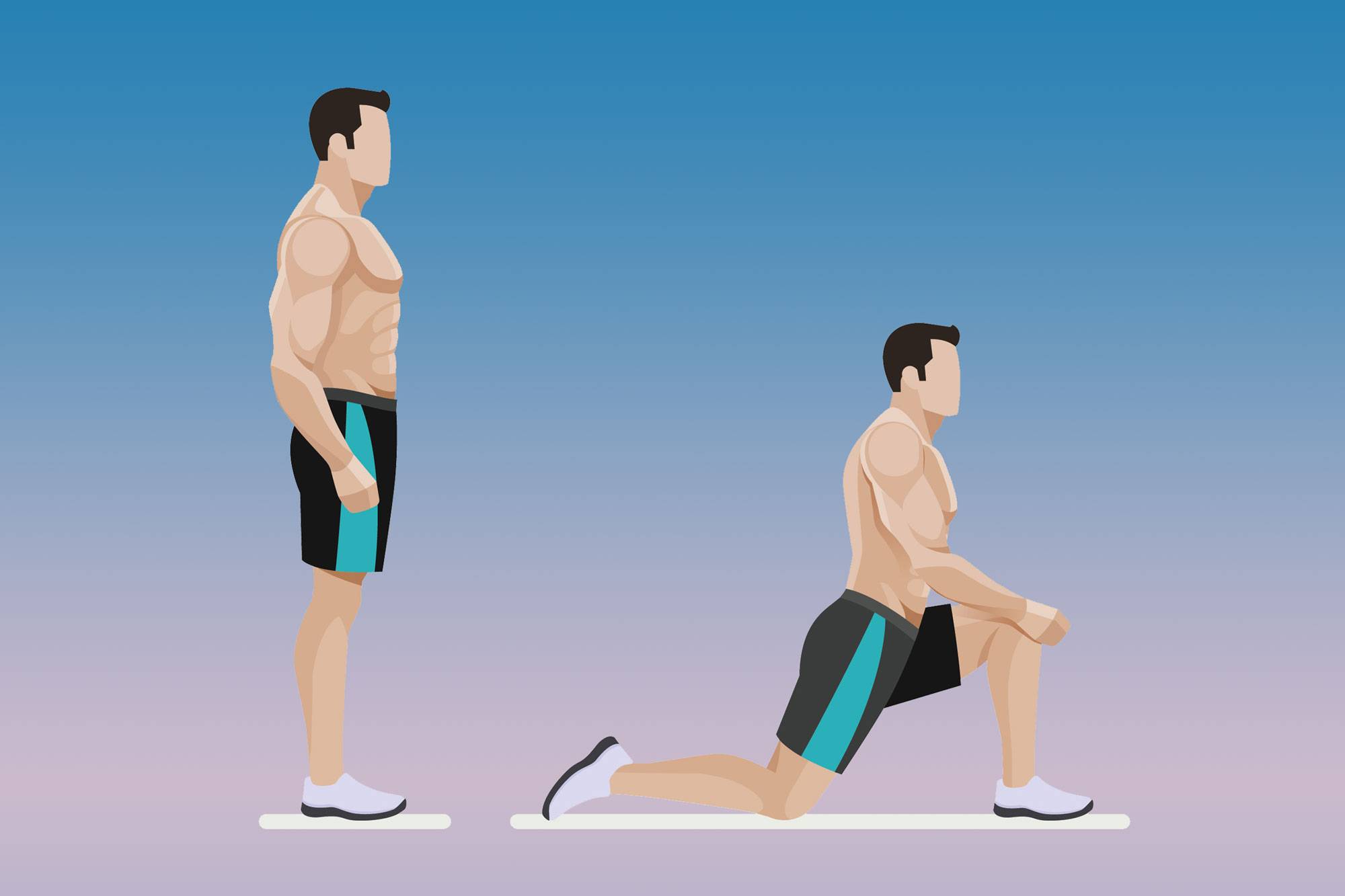 Исходное положение — стоя ровно, ноги чуть уже ширины плеч. На выдохе, держа пресс в осознанном напряжении, сделайте шаг одной ногой вперёд, затем опустите вес тела вниз.