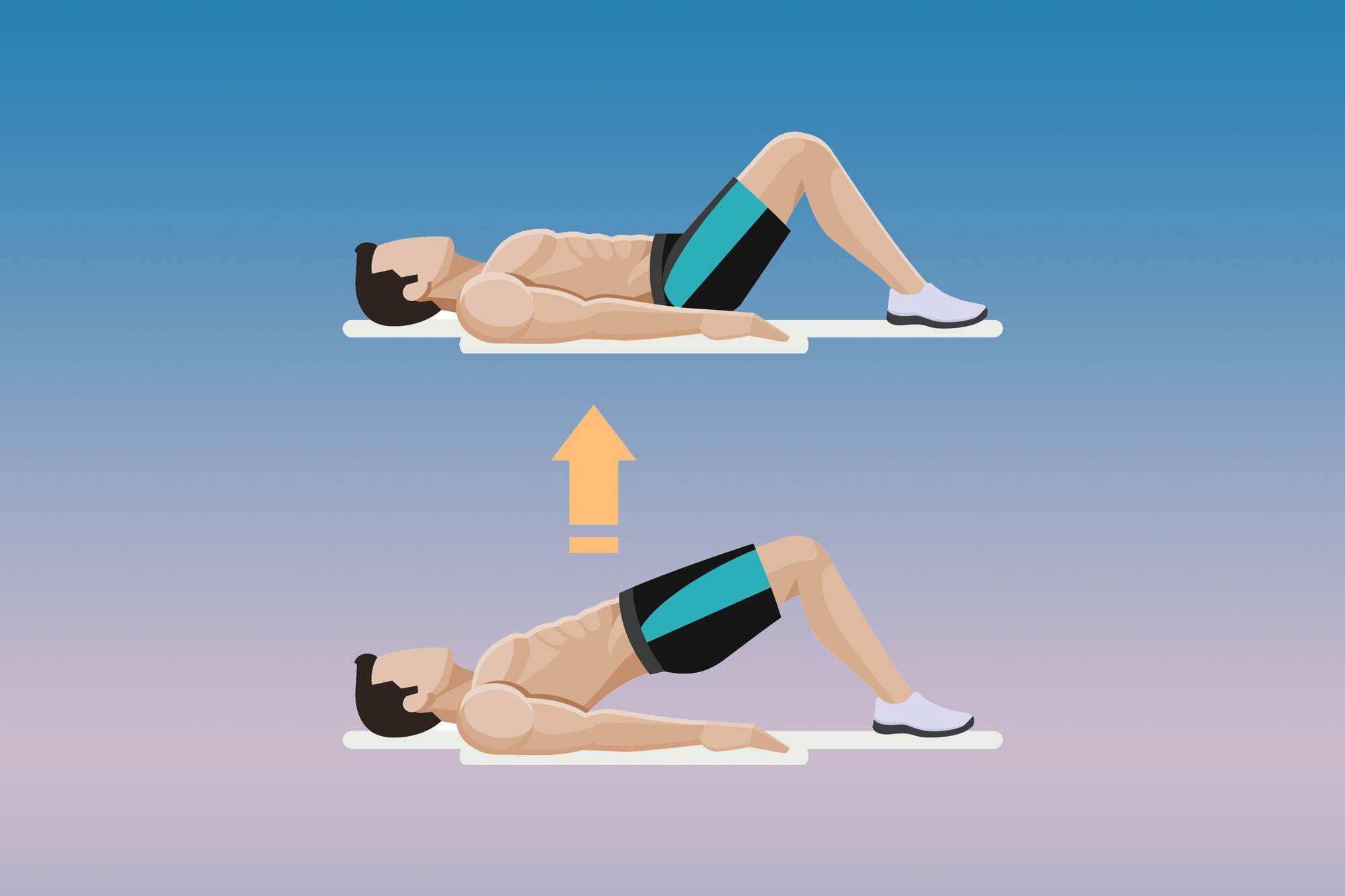 Исходное положение — лежа на спине, руки вдоль тела, ноги плотно стоят на полу. На вдохе напрягите пресс и, за счёт активации ягодиц, поднимите таз вверх, вытягивая позвоночник в прямую линию.