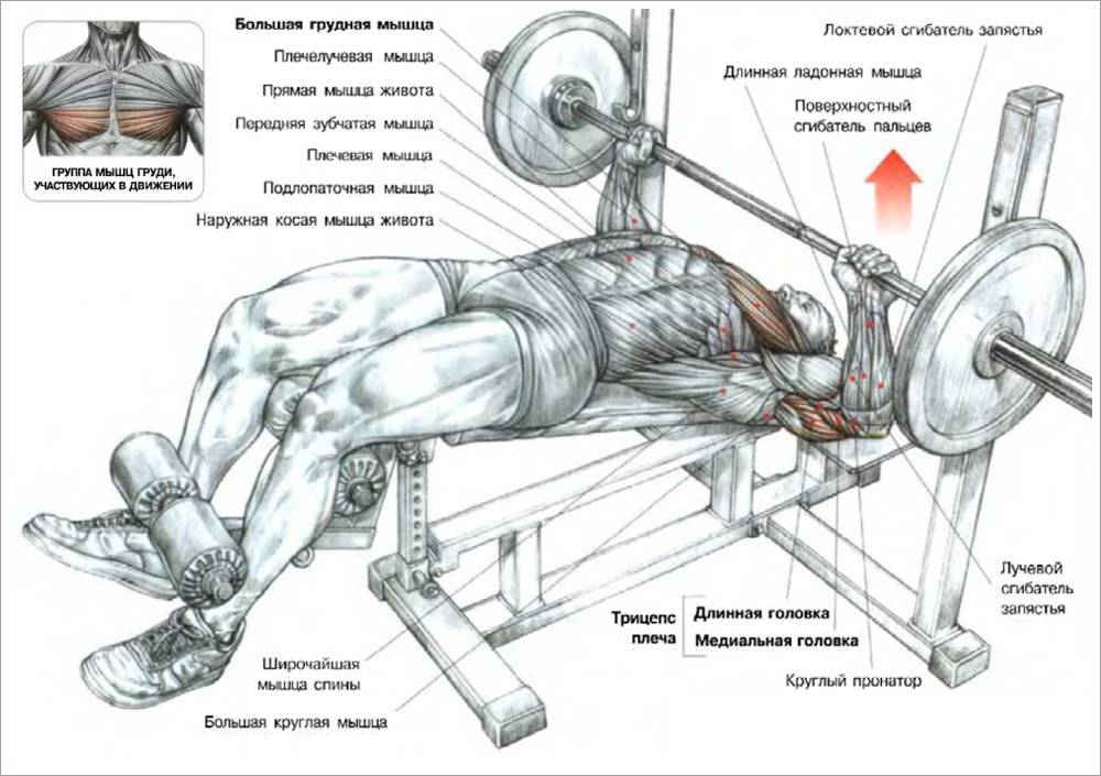 Этот вариант жима штанги или гантелей используется для развития верхних частей грудных мышц (область ключиц), которые трудно развить обычным жимом лежа.