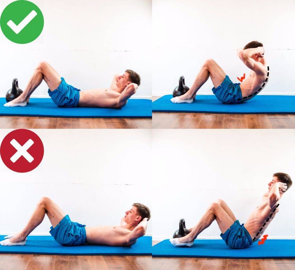 Важно выполнять подъемы туловища строго за счет мышц пресса. Новички со слабыми мышцами живота активно пытаются помогать себе раскачиванием корпуса и махами рук. Этого допускать не рекомендуется;