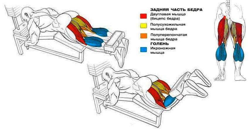 Основной движитель – бицепс бедра; Помогают движению подколенная, икроножные, ягодичные мышцы. Но в варианте работы в тренажерах помощь не основных групп мышц минимальна;