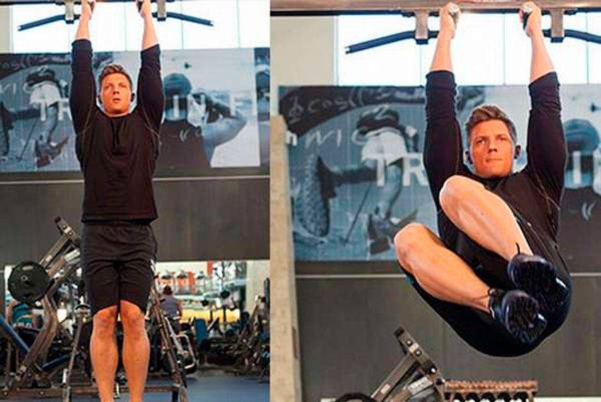 А это как раз движение для укрепления пресса из области ЛФК. Атлет висит на шведской стенке или турнике, сокращает пресс и приводит свои колени к груди. Нужно следить, чтобы движение происходило за счет сокращения пресса, а не путем забрасывания ног наверх.