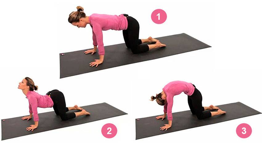 Техника выполнения: опуститесь на колени и поставьте руки перед собой на ширину плеч. Ноги могут быть как вплотную прижаты друг к другу, так и слегка раздвинуты. Глубокий вдох — прогните спину, вытягивая голову вверх, слегка запрокинув её назад. Задержитесь на несколько секунд. Глубокий выдох — вытяните весь грудной отдел вверх, максимально округляя его, а голову опустите вниз и прижмите подбородок к груди. Повторите 10 раз. Непременно следите за дыханием — каждый вдох и выдох должны быть глубокими и соответствовать движениям.