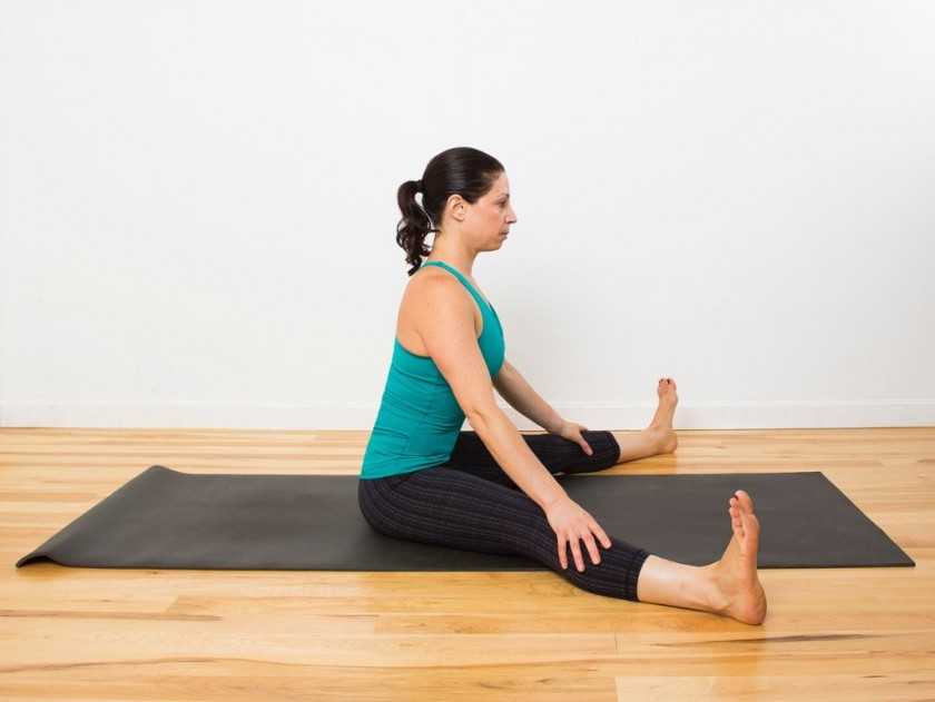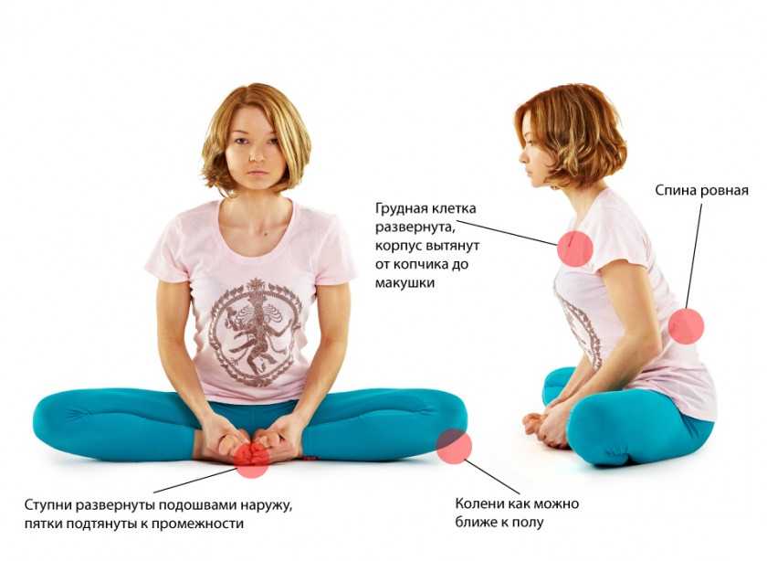 В первом случае вам необходимо сесть, спина должна быть полностью прямой, таз максимально выдвинут, ноги согните, а колени разведите. Положите руки ниже коленей с внутренней стороны, необходимо следить за тем, что бы они оставались прямыми.